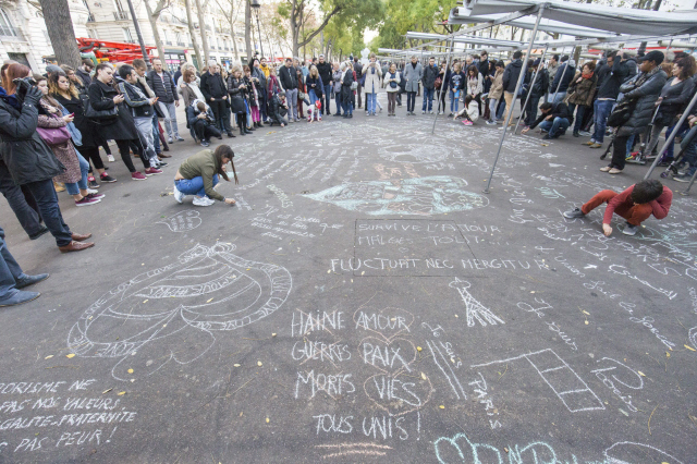 지난 11월15일 이슬람국가(IS) 테러 사건이 일어난 프랑스 파리 바타클랑 극장 근처 리샤르 르누아르 대로에서 시민들이 IS 테러 희생자들을 기리는 문구를 분필로 쓰고 있다. EPA 연합뉴스
