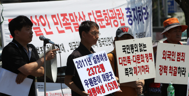 외국인 일반을 향한 혐오표현은 ‘집단’ 전체를 향한 것으로 더욱 심각한 일로 여겨진다. 2012년 외국인범죄 척결연대 회원들이 집회를 하고 있다. 연합뉴스