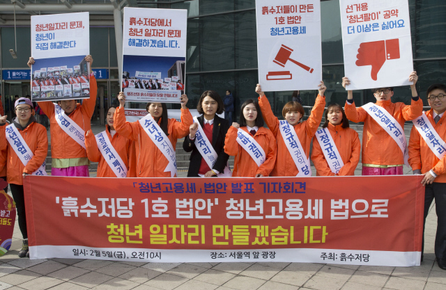지난 2월5일 서울역에서 ‘흙수저당’ 회원들이 청년고용세 법안 제정을 주장하는 기자회견을 열었다. 얼마 지나지 않아 20~30대 가구소득이 사상 최초로 줄었다는 뉴스가 이어졌다. 연합뉴스
