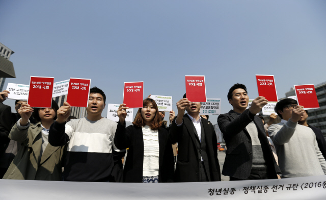 청년단체들이 지난 4월15일 ‘청년실종, 정책실종’ 총선을 규탄하는 기자회견을 열고 있다. 청년이 새로운 실험을 하려면 안정감을 느낄 생존 기반이 필요하다. 한겨레 김명진 기자