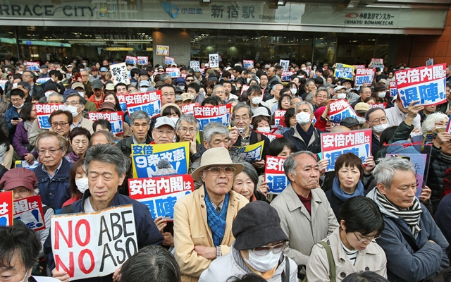 3월18일 일본 도쿄 신주쿠역 앞에서 시민들이 아베 신조 내각의 퇴진을 요구하고 있다. 연합뉴스