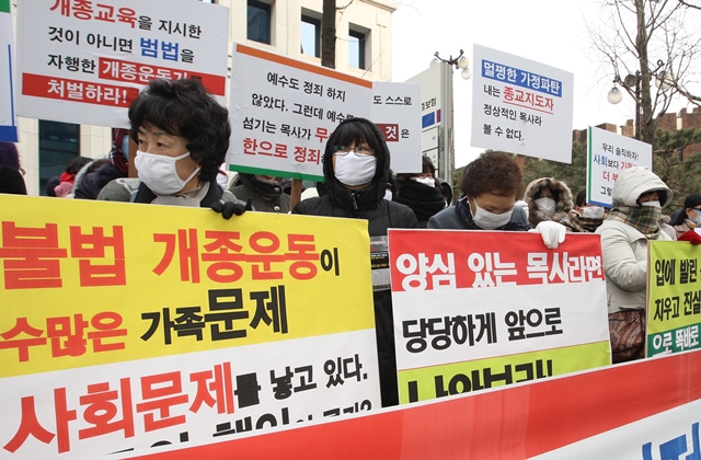 ‘강제개종교육’ 반대 집회에 참가한 피해자들. 한겨레 신소영 기자