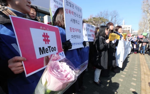 여성단체 회원들이 3월1일 대검찰청 앞에서 검찰조직 내 성폭력 사건의 진상 규명을 촉구하고 있다. 한겨레 백소아 기자