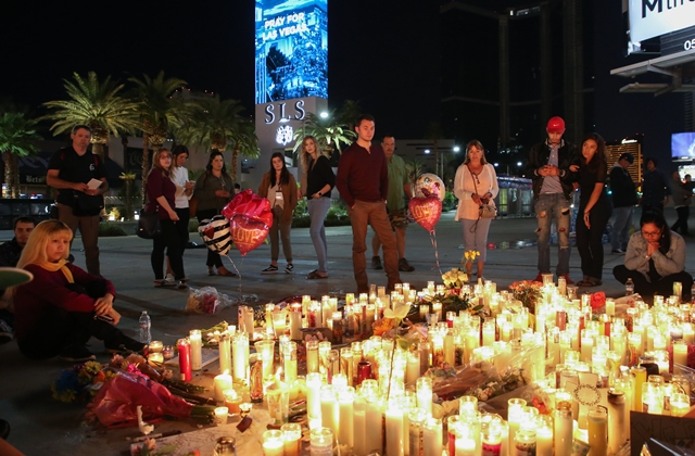 10월1일 미국 라스베이거스에서 벌어진 총기 난사 사건의 피해자를 추모하는 촛불을 시민들이 바라보고 있다. EPA 연합뉴스