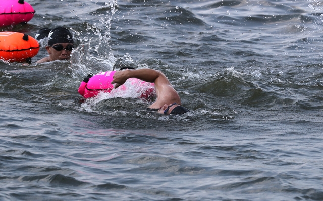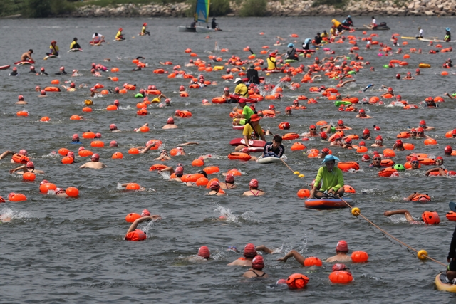 서울 송파구수영연맹이 8월18일 주최한 ‘2019 한강크로스스위밍챌린지’에 참가한 선수들이 한강 잠실대교 수중보 남단에서 헤엄치고 있다. 류우종 기자