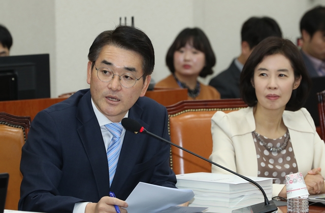 박용진 더불어민주당 의원(왼쪽)이 10월17일 오후 국회 교육위원회 국정감사에서 사립유치원 비리에 대해 질의하고 있다. 한겨레 강창광 기자
