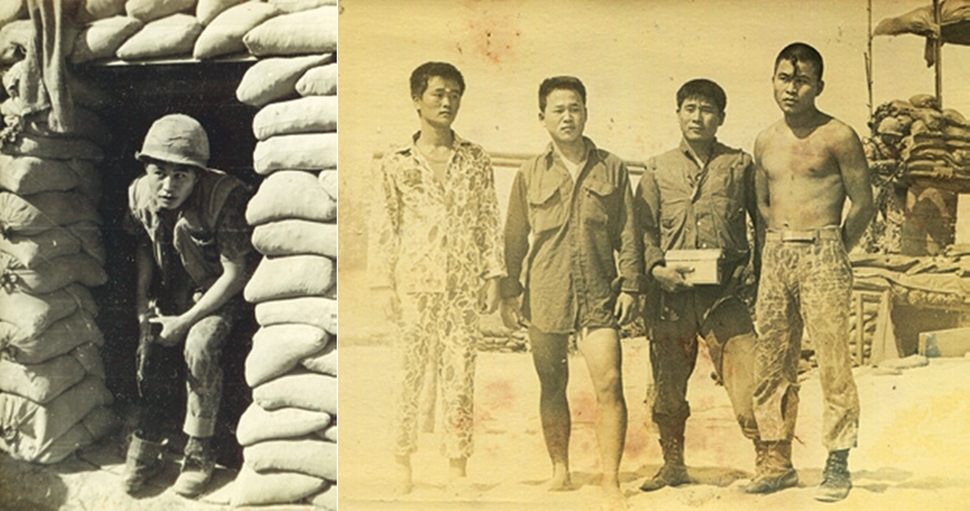 류진성씨가 1968년 베트남에서 찍은 사진. 디엔 반현 내에 있던 1중대2소대 취침 벙커 앞(왼쪽). 중상을 당하기 직전인 경비중대 2소대 시절. 맨 오른쪽이 류씨(오른쪽). 류진성씨 제공