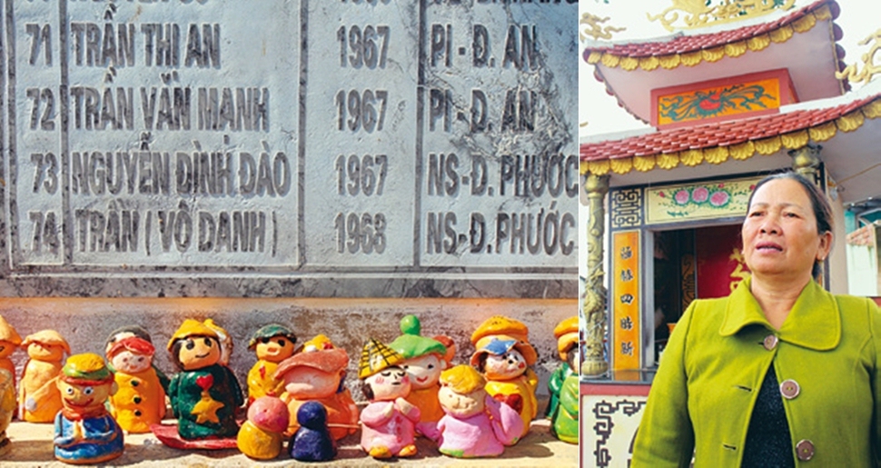‘베트남 프렌즈’라는 한국의 청소년단체 회원들이 퐁니마을 위령비 앞에 피해자 이름이 새겨진 예쁜 인형을 만들어 놓았다. 위령비 아랫부분에 가장 어렸던 1967년생과 1968년생 희생자들의 이름이 보인다. 2018년 2월(왼쪽). 학살 사건 유가족들이 희생자들을 기리기 위해 돈을 모아 2018년 퐁니마을 1번 국도 변에 새로 세운 사당. 이곳은 사건 당일 분노한 주민들이 주검을 늘어놓았던 바로 그 현장이다. 생존자 응우옌티탄이 사당 앞에서 포즈를 취했다. 2019년 1월(오른쪽). 고경태