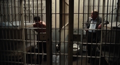 마치 야생동물처럼 경찰에 포획된 프레디는 이미 갇혀 기다리던 랭커스터(필립 시모어 호프먼) 옆에 나란히 구금된다(사진). 카메라는 하나의 프레임을 잡고 있지만, 설치된 두 감옥 때문에 두 프레임을 병렬시킨 것처럼 보인다. 여기까지가 시나리오와 연출이 그리고 미술과 촬영이 개입할 수 있는 영화 현장의 세팅이다. 원래 대본에는 이 둘이 투옥된 사정을 알리는 목적으로 배치된 신이었다. 하지만 움직임 없는 카메라와 편집되지 않은 컷 속에서 두 배우는 즉흥적이고 동물적인 퍼포먼스로 이 비트의 목적을 재창조한다.