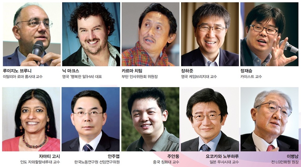 우리나라 지성들의 특강도 열립니다. 장하준 영국 케임브리지대학 교수는 ‘행복에 대한 경제학적 이해’를 강의하고, 정재승 카이스트 교수는 우리의 뇌에게 ‘지속가능한 행복’을 묻습니다. 안주엽 한국노동연구원 선임연구위원은 ‘일과 행복의 변화 추이’에 대한 국책연구기관 합동 연구결과를 발표합니다.
