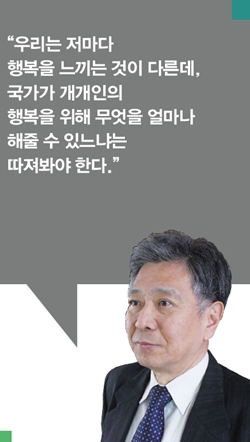 경제지표는 세계 10위권 안팎을 오르내릴 정도로 비교적 양호한 반면, 자살률·독신율·이혼율·음주량·고소율 같은 사회지표는 바닥권을 벗어나지 못하는 저열한 상태다. 이를 대비해보면, 행복국가 반열에 진입하기 위한 공적인 정책 대안이나 제도적 노력이 강구돼야 한다는 “조급증이 발동하는” 게 사실이다. 그러나 그는 ‘국민행복시대’는 정치적 레토릭이거나 오만한 발상일 수 있다고 말했다. “우리는 저마다 행복을 느끼는 것이 다른데, 국가가 개개인의 행복을 위해 무엇을 얼마나 해줄 수 있느냐는 따져봐야 한다.”