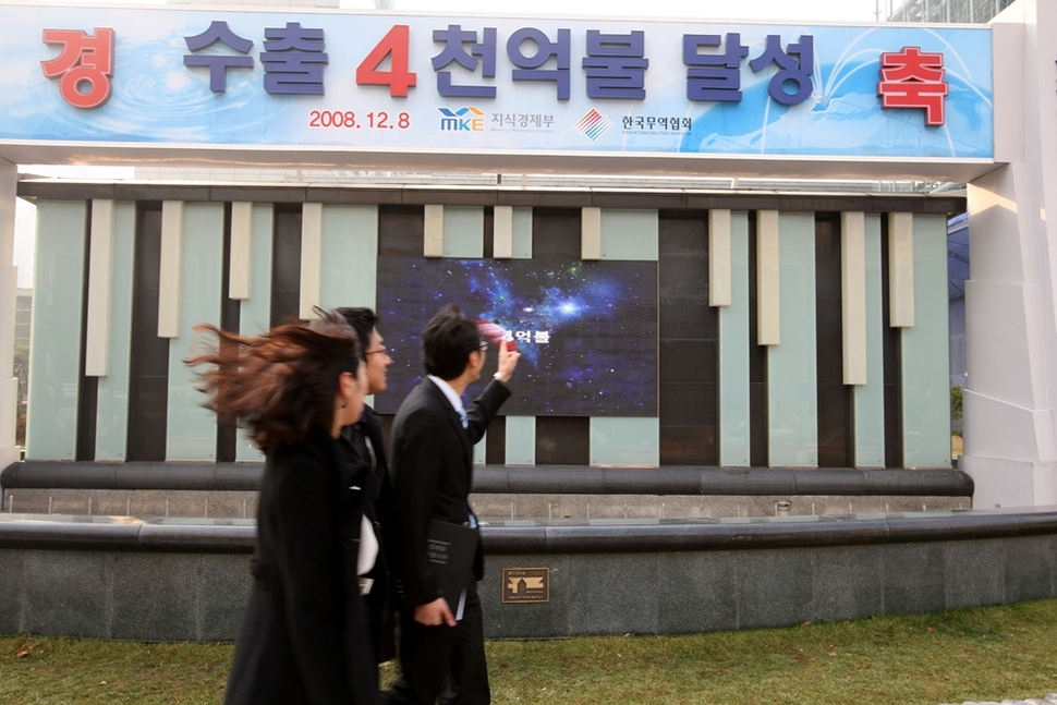 2008년 12월 서울 삼성동 코엑스 앞에 세워진 수출 4천억달러 달성 기념 현판 앞을 시민들이 지나고 있다. <한겨레> 김명진