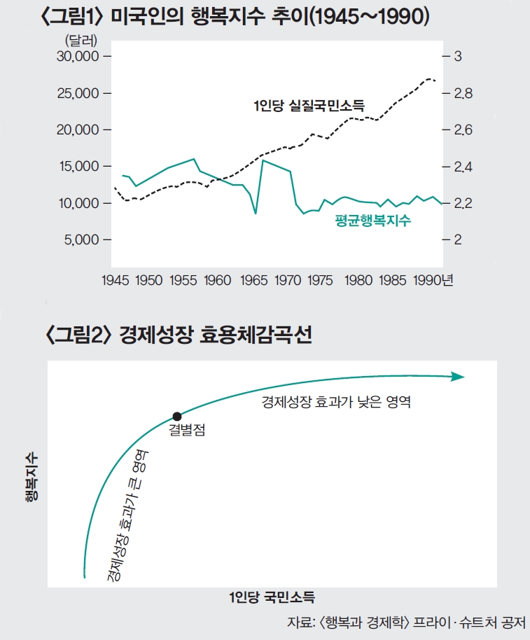 경제학자들이 왜 행복에 관한 연구를 외면했을까? 이들은 소득수준이 높아질수록 국민들이 더 행복해진다고 굳게 믿은 탓에 연구할 필요성을 느끼지 못했기 때문이다. 그러나 현실을 면밀히 관찰하는 것이 습관화된 자연과학자들은 이런 고정관념에 의혹을 품었다. 그리고 이 의혹을 뒷받침하는 증거를 줄줄이 찾아냈다. 1945~2000년 56년 동안 미국의 1인당 국민소득은 약 3배 늘었지만 이 기간에 미국 국민 중에서 행복하다고 느낀 사람의 비율은 거의 변화가 없었다.