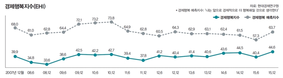 여러분 경제적으로 행복하세요? 그나마 측정하기도 비교하기도 쉬울 것으로 보이는 ‘경제적 측면에서의 행복감’을 중심으로 현대경제연구원이 매년 6월과 12월 두 차례에 걸쳐 ‘경제행복지수’(EHI)를 발표한다. 고용·소득·자산·생활수준·물가·분배 등과 같은 경제 관련 지표를 중심으로 주관적 만족감을 물어보는 방식이다. 가장 최근(2015년 12월)에 조사된 경제행복지수는 100점 만점에 44.6점에 불과하다. 2007년부터 모두 17회에 걸친 조사를 해오고 있지만 단 한 번도 50점을 넘어본 적이 없다. 그만큼 2007년 이후 우리 국민의 경제적 만족감은 바닥이다. 경제행복지수를 구성하는 6개 항목별로 살펴보면, 경제적 안정(55.4점)과 경제적 우위(53.0점)는 상대적으로 높은 편이다. 경제적 발전(47.2)과 전반적 행복감(47.2점)은 중간값인 50점에는 미달하지만 전체 평균(44.6점)보다 높다. ‘경제적 평등’(22.1점) 점수가 가장 저조하고, ‘경제적 불안’(30.7점) 점수가 두 번째로 부진한데, 이 2개 항목이 전체 평균 점수(44.6점)를 낮추는 요인으로 작용한다.