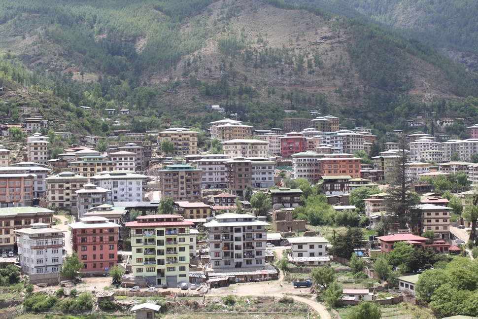 부탄 아파트 단지 풍경. 부탄에서는 건축물 높이를 3층 이내(수도 팀푸에서는 6층)로 규제한다. 박진도