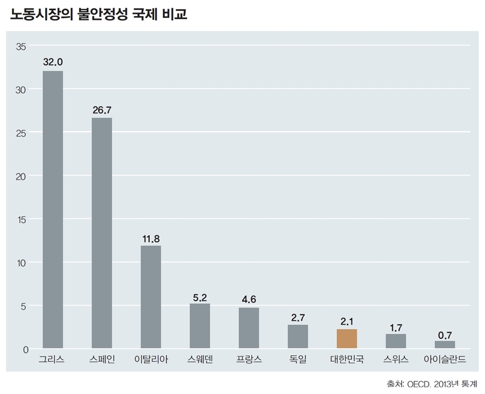 이런 사실을 우리나라 상황에 결부시켜보면 흥미로운 사실을 발견할 수 있다. 지난 1월 경제협력개발기구(OECD)가 발표한 ‘노동시장의 안정성 측정과 개인적 행복에 대한 의미의 평가’ 보고서에서는 “실업위험과 고용보장의 정도가 개인의 주관적 안녕감(행복)에 매우 중요한 영향을 미친다”고 결론지었다. 또 34개국 비교연구를 통해 각 국별 행복 편차가 발생하는 이유를 실업률 지표보다 ‘어떤 실업이냐’를 의미하는 실업의 성격에서 찾고 있다. 2013년 OECD 통계에 따르면, 실업자가 될 가능성과 예상 실업 기간을 종합 산출하는 ‘실업위험’은 한국이 34개국 중 가장 낮다. 일반적으로 고용불안이 일상화돼 있다고 평가받는 우리나라 실업위험이 이렇게 낮게 나온 이유가 뭘까? 실업 기간이 짧기 때문이다. 한국의 경우 실업자가 될 가능성은 OECD 회원국 중에서 중간 수준이지만, 평균 실업 기간은 2개월에도 미치지 못할 정도로 최하위다. 고용보험이 부실하기 때문에 실업 이후 당장 생계위협을 느껴 원하지 않는 일자리라도 빨리 찾아야 하기 때문이다. 이는, 우리나라의 낮은 실업위험이 세계 최하위 근속연수 및 높은 임시직 발생빈도와 연관돼 있음을 보여준다. 실업위험은 실업보험 수혜율과의 상호작용을 통해 노동시장 불안정성을 결정한다. 실업급여율과 소득대체율을 종합적으로 고려한 ‘실질실업보험률’을 계산하면, 한국은 OECD 34개국 중 실업보험 혜택이 15번째로 낮다. 이런 이유로 한국은 지표상으로는 노동시장 안정성이 34개국 중 5번째로 높은데도, 주관적 안녕감을 표현하는 행복지수는 26위에 머물러 있다. 한국도 다른 나라와 마찬가지로 노동시장 불안정성과 행복감 사이에 부(-)의 상관관계를 보이지만, 동일한 노동시장 안정성하에서 삶의 만족도가 다른 나라보다 현저하게 낮다. 우리나라 사람들이 느끼는 삶의 만족도는 노동시장 안정성이 한국과 비슷한 오스트리아·룩셈부르크에 비해 훨씬 낮다. 한국 실업자가 다른 나라의 실업자보다 불행감을 훨씬 더 느끼는 이유는 여러 요인이 작용하겠지만, 노동시장의 불안정성을 제어하기에는 역부족인 사회안전망 부실에서 원인을 찾을 수 있다. 인간의 주관적 안녕감을 표현하는 행복도, 개인 문제로 환원할 수 없는 사회적 맥락에서 바라볼 필요가 있다. 즉, 실업을 개인 문제로 돌리는 것이 아니라, 성과지향적 경쟁사회로 인해 노동시장에서 ‘탈락’되거나 ‘배제’되는 현상으로 보아야 할 것이다. 한국 사회에서 실업이 불가피한 것이라면 실업자를 포용할 수 있는 제도적 기반으로서 고용안전망 확대·강화가 요청되는 것이다. 이상호 한겨레경제사회연구원 연구위원 lshberlin0612@hani.co.kr ※카카오톡에서 <한겨레21>을 선물하세요 :) ▶ 바로가기 (모바일에서만 가능합니다)