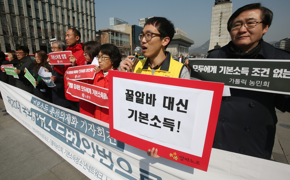지난 3월16일 오전 서울 광화문광장에서 기본소득한국네트워크 등이 개최한 ‘기본소득 총선의제화 기자회견’에서 참가자들이 기본소득 실현을 위한 법적토대 마련을 촉구하고 있다. 연합뉴스
