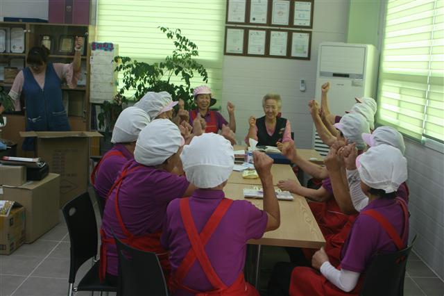 “사랑합니다” 사무실 문을 들어오는 할머니들의 갑작스런 인사말에 당황할 때쯤 김금순(67) 대표의 조언이 이어진다. “워크숍 때 정한 실천 사례로 ‘사랑합니다’라고 인사하는 건 좋은데, 눈을 마주치고 하면 더 좋을 것 같아요” 다시 한번 할머니들이 모두 힘차게 “사랑합니다” 외치며 조회가 시작되었다.