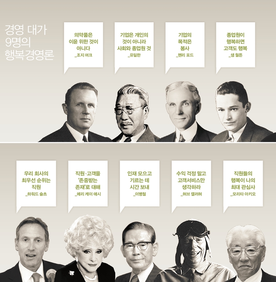 “의약품이란 환자를 위한 것이지 결코 이윤을 위한 것이 아니다. 이윤이란 부수적인 것에 불과하다. 이 사실을 망각하지 않는 한 이윤은 저절로 나타나기 마련이다. 이것이 머크의 경영이념이다.” 349년의 역사를 자랑하는 세계적 제약회사 머크사의 조지 윌리엄 머크 전 회장의 말이다. 미국 하버드대 경영대학원의 짐 헤스켓과 존 코터 교수는 <기업문화와 성과>라는 책에서 “구성원들이 가치를 공유하고, 그에 기초한 강력한 조직문화를 갖고 있는 조직은 이윤추구를 목적으로 삼았던 회사보다 성과가 높다. 총수입은 4배가 많았고, 일자리 수는 더 늘어났으며, 주식가격은 12배, 이윤은 750배가 높았다”고 분석했다. 행복경영은 ‘남을 먼저 이롭게 함으로써 내가 이롭게 된다’는 경영이념을 먼저 확고히 하고 이를 전 직원과 함께 공유하는 데서 출발하는 것이다.
