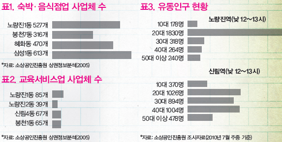 별천지라도 음풍농월과는 상관없다. 노량진은 거친 땅이다. 유배지다. 젊음의 호르몬을 꽁꽁 묶어 스스로 유배시키는 땅이다. 유배지의 중심지는 학원이다. 지하철 1호선 노량진역 앞, 왕복 8차선 도로를 따라 적어도 20여 개의 공무원 시험 준비 학원이 있다. 몇몇 대입·편입 학원을 빼고도 그만큼 많다. 동서를 따라 1km에 걸쳐 늘어선 학원 건물들은 노량진의 첫 껍질일 뿐이다. 껍질을 벗겨 뒷골목, 그리고 다시 뒷골목으로 가면 대형 학원의 분점과 소형 학원들이 곳곳에서 얼굴을 내민다. 그들을 모두 더한 수가 얼마인지 짐작조차 어렵다. 줄잡아 100여 개의 학원이 있을 것으로 추정할 뿐이다. 웅진패스원·남부행정고시학원·이그잼고시학원·베리타스 등이 ‘노량진 빅4’로 통한다. 이들 학원이 노량진 공시생의 대부분을 품는다.