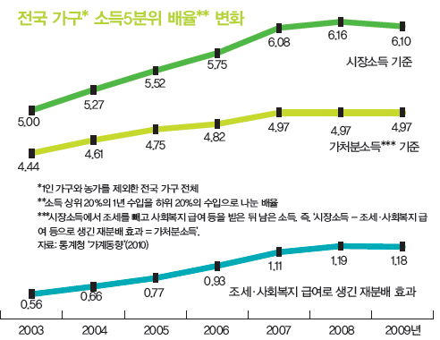 ‘평등 사회’에서 ‘불평등 사회’로 우리는 뒷걸음질하고 있다. 우선 우리 정부의 인식 수준을 보기 위해 ‘국민건강증진종합대책’을 펼쳤다. 종합대책은 우리나라 보건정책의 뼈대에 해당한다. 정부는 2003년과 2007년에 두 차례 종합계획을 발표하고, 현재 세 번째 종합대책을 마련하고 있다. 정부가 지난해 11월 공청회에서 제시한 종합대책 초안을 살펴보니, 종합계획의 2대 총괄목표 가운데 하나로 ‘건강 형평성 제고’가 제시됐다. 2007년에 만든 종합계획에도 같은 내용이 있었다. 문제는 각론이었다. 82쪽에 걸친 공청회 자료집에서는 건강 형평성을 높이기 위한 체계적인 정책들은 마련되지 않았다. 자료집은 건강 형평성 문제에 대해 “총괄에서 구체적인 지표를 세우지 않고 각 분과의 중점 과제에서 반영”하겠다고 밝혔다. 김명희 시민건강증진연구소 상임연구원은 “초안에서 건강 형평성을 이루겠다는 목표는 설정됐지만, 이를 뒷받침할 만한 내용이 없어서 정부가 정책 의지가 있는지 두고 볼 일”이라고 말했다. 두 번째 우리나라의 소득분배 동향을 살펴봤다. 숨이 막힐 지경이었다. 그만큼 가진 이들과 없는 이들의 소득 격차가 빠르게 벌어졌다. 통계청이 지난해 내놓은 지니계수와 소득 5분위 배율 등 소득분배 지수를 보면 소득 불평등 정도가 급격히 악화하고 있다. 2003년부터 집계되고 있는 2인 이상 가구 집계 지니계수를 보면 2003년 0.293에서 2009년 0.319까지 커졌다. 지니계수는 0~1 사이에서 분포하는데, 0은 사회 성원이 완전히 동등하게 소득을 나눴을 때, 1은 가장 부유한 한 사람이 모든 소득을 독식했을 때 나오게 된다. 따라서 1에 가까워질수록 소득 불평등 수준이 커진다는 뜻이다. 불과 6년 사이에 시장소득 지니계수가 0.026이나 늘었다. 부의 쏠림이 크다는 뜻이다. 이 과정에서 국가는 무슨 일을 하고 있었을까. 우리나라의 가처분소득 기준 지니계수를 보면 2009년 0.293이었다. 시장소득 지니계수보다 0.026이 낮았다. 이 말은 정부가 조세나 사회복지 급여 등 재분배를 통해 계급 간 소득 격차를 약간 낮췄다는 뜻이다. 말하자면 정부가 소득 형평성에 기여했다는 뜻이다. 스웨덴의 마법, 한국의 방치