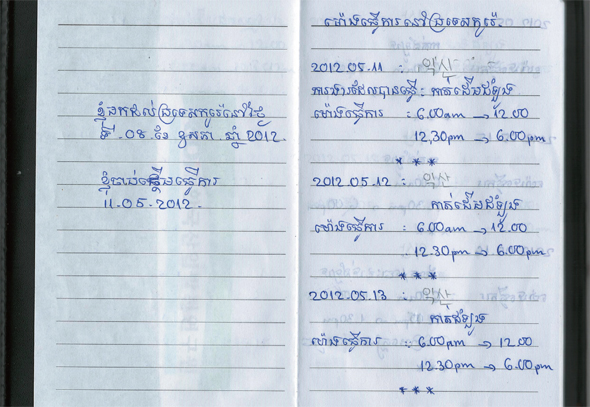 캄보디아 여성 농업이주노동자 손 비솟(가명)이 한국의 첫 직장에서 일하며 작업 내용과 시간, 장소를 꼼꼼히 기록한 ‘수첩 일기’. 손 비솟 제공