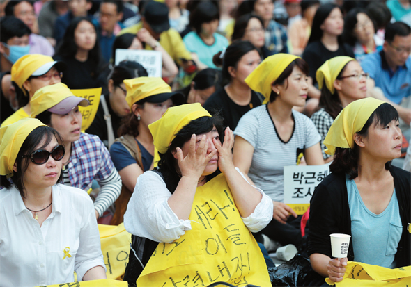 4월16일 세월호 참사 이후 한국 사회는 집단 트라우마를 앓고 있다. 트라우마에서 벗어나려면 감정을 억압하지 않고 표출할 수 있는 공간이 마련돼야 한다. 엄마들이 6월7일 서울 중구 청계광장에서 열린 세월호 참사 촛불집회에 참석해 눈물을 흘리고 있다. 한겨레 이종근 기자