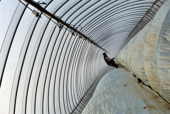 이주노동자들이 비닐하우스 안에서 골조 파이프를 운반하고 있다. 김정용 제공