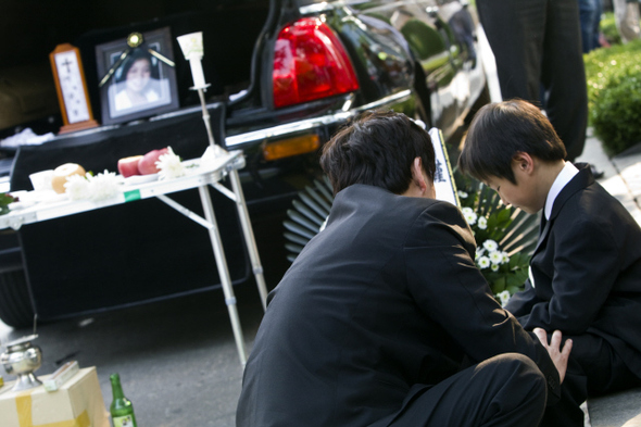 법원은 올해 삼성전자 반도체 노동자의 뇌종양을 산업재해로 처음 인정했다. 2012년 5월 삼성전자에서 일하다 뇌종양으로 숨진 이윤정씨의 노제에서 이씨의 남편과 아이가 슬퍼하고 있다. 박승화 기자