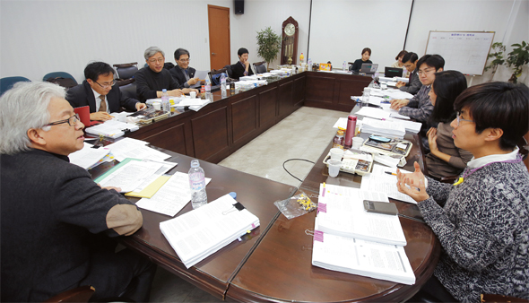 지난 12월2일 저녁, 올해의 판결 심사위원 9명이 서울 공덕동 한겨레신문사에 모여 최종 선정작을 추려내기 위해 열띤 토론을 하고 있다. 정용일 기자