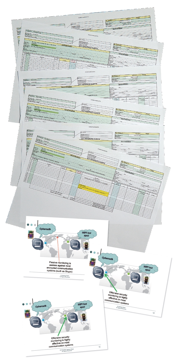 이탈리아 업체 ‘해킹팀’에서 유출된 국가정보원의 거래 영수증(위). 이 업체는 기존 패킷 감청이 불완전하다며 자사의 스파이웨어 직접 설치를 적극 홍보해온 것으로 드러났다.