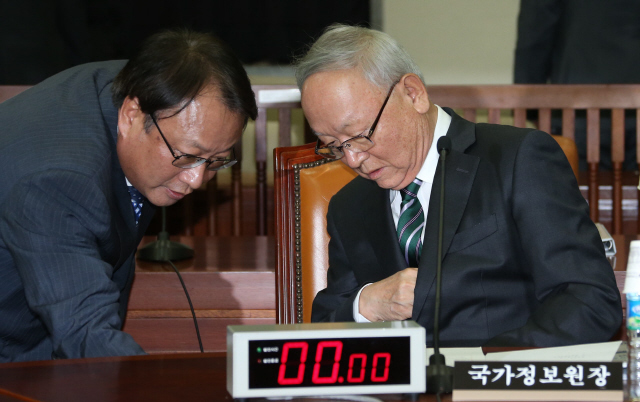 이병호 국가정보원장(오른쪽)이 29일 오후 국회 정보위원회에 출석해 차장과 이야기하고 있다. 한겨레 이정우 선임기자