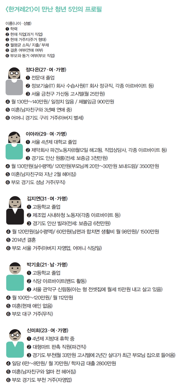 3평 남짓한 다은씨의 방에는 바깥공기를 쐴 창문도 없다. 공용 화장실에서 찬물로 샤워하고 밤새 더위를 버텨야 한다. 회사 회의실, 찜질방에서 생활하던 시절보다는 낫다. 월 25만원으로 서울에서 ‘내 공간’을 갖기란 쉽지 않다. 얇은 합판을 사이에 둔 이웃인 옆방 조선족 아저씨가 방에서 삼겹살을 구워 먹는 것쯤, 새벽 4시면 일하러 나가느라 시끄러운 것쯤은 대수롭지 않다. 다은씨는 “침대에 누워 기다란 우산 하나 들고 있으면 전등 스위치도, 텔레비전도 켜고 끌 수 있어 좋다”며 깔깔 웃었다. 다은씨 같은 청년들의 빈곤 문제가 심각하다. 장하나 새정치민주연합 의원실이 한국보건사회연구원에 의뢰해 조사한 청년 빈곤율은 노인 빈곤율과 어금지금할 정도로 높게 나타났다. 만 18~24살은 5명 가운데 1명꼴(19.7%)로, 만 25~29살은 10명 가운데 1.2명꼴(12.3%)로 상대적 빈곤 상태인 것으로 나타났다. 각각 만 60~64살의 빈곤율(20.3%), 만 50~59살의 빈곤율(11.4%)과 비슷한 수준이다. 빈곤율은 가처분소득이 중위소득 50% 미만인 사람의 비율이 얼마인지를 보여주는 지표다. 2015년도 중위소득 50%를 월급으로 따져보면, 1인 가구 기준 78만원, 4인 가구 기준 211만원 남짓이 된다. 다은씨는 최근 취업을 했기 때문에, 소득빈곤에는 해당하지 않지만 주거빈곤에는 포함된다. 국토교통부가 고시하는 최저 주거 기준은 1인당 14m²(4.2평 남짓)이다. 서울에 사는 청년 5명 가운데 1명꼴로 고시원, 옥탑방 등 주거빈곤 상태에 놓여 있다(‘청년, 빈곤의 미로에 갇히다’ 표1·4 )참조. 하지만 다은씨는 국가의 도움을 받아본 적이 없다. 아버지는 건설 현장을 다니는 목수였다. 벌이는 시원찮았다. 엄마·아빠는 가난 때문에 지긋지긋하게 싸웠다. 5년 전 아버지가 홀연히 세상을 떠난 뒤로는 절망스러운 나날이 이어졌다. 우울증을 앓는 어머니는 돈을 벌지 못한다. 다은씨는 17살 때부터 패스트푸드점, 백화점, 피아노 학원, 레스토랑, 도서관 등에서 아르바이트를 했다. 고용지원센터 취업 창구에도 몇 차례 가봤지만, 어울리지 않는 경리 업무만 추천해줬다. 중학교 때 ‘작곡가’를 꿈꾼 이후로, 다은씨에게 꿈은 사라졌다. 스무 살 때 음악 페스티벌에서 만난, 1천 일 넘게 사귄 남자친구가 없었다면 삶은 더 잿빛이었을지 모른다. 서울의 4년제 대학을 다니는 남자친구는 졸업 유예 상태다. 배고픈 청춘의 데이트는 선택지가 많지 않다. 음식을 사다가 고시텔의 좁은 방 안에서 나눠먹는다. 모처럼 고시텔에서 나와 다은씨와 남자친구와 함께 식당에서 저녁밥을 먹고 있는데, 휴대전화 카카오톡 알림 메시지가 울렸다. 지난 8월10일 만났던 비정규직 노동자 이아라(29·가명)씨였다. “오늘 회사에서 갑자기 자르겠다는 연락이 왔어요.” 입속의 밥알이 갑자기 돌 씹는 듯이 서걱거렸다.