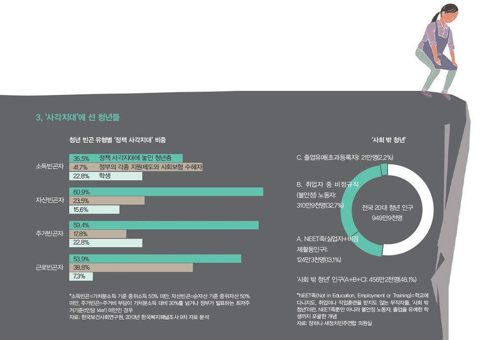 지금 한국 사회의 문제는 모두 청년을 향한다. 비정규직, 저임금, 낮은 출산율, 주거, 불평등, 가계부채 등 모든 이슈가 청년의 삶 안에 웅크리고 있다. <한겨레21>은 장하나 새정치민주연합 의원실과 함께 지난 3월부터 청년 빈곤의 복합적인 현실을 드러내고 이를 해결할 제도를 어떻게 마련할 수 있을지 궁리해왔다. 그 1차 결과물을 내놓는다. 국책연구기관 등에 의뢰한 청년 빈곤 관련 통계를 정리하고, ‘푸른 청춘’이 되지 못하는 청년들을 직접 만났다. (가칭)청년경제기본법의 얼개도 처음 공개한다. 청년들의 삶이 좀더 나아질 때까지 후속 보도는 이어진다.