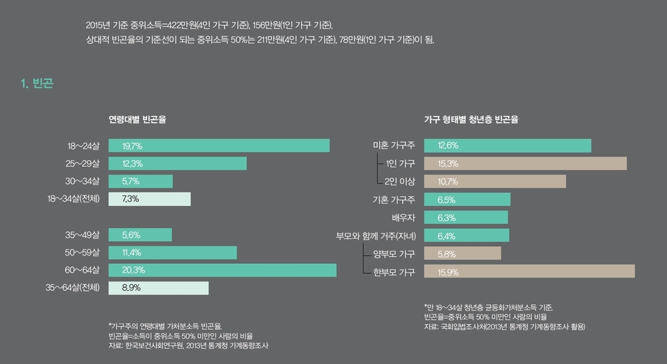 청년 빈곤의 실태를 한눈에 보기 쉽게 숫자와 그래프로 정리했다. 장하나 새정치민주연합 의원실이 한국보건사회연구원에 의뢰해 받은 자료에서는 청년 빈곤이 노인 빈곤만큼 심각하다는 사실(표1)과 정부 정책의 ‘사각지대’에 놓인 빈곤 청년이 많다는 사실(표3)이 새롭게 드러났다. 청년 실질실업률은 공식 실업률(10.2%)의 3배 가까이 되는 30.9%에 이른다(표2). 청년의 주거빈곤·채무와 관련해선, 서울시가 지난 4월 내놓은 ‘2015년 서울 청년은, 지금’에 나온 통계를 일부 인용했다(표4). _편집자
