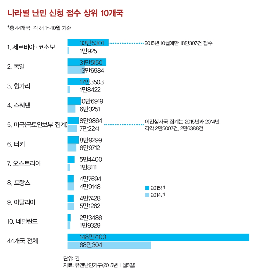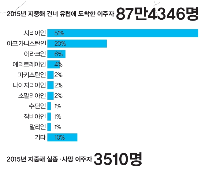 이들의 출신 지역은 시리아(51%), 아프가니스탄(20%), 이라크(6%) 순으로 많다. 역대 최대 규모였던 2011년(7만 명)의 3배 수준이던 2014년(21만6054명)의 4배를 일찍이 넘었다. 올해 지중해를 건너다 이주자 3510명이 익사하거나 실종됐다. 9월2일 터키 보드룸 해변에서 주검으로 발견된 3살배기 알란 쿠르디도 그중 하나다.