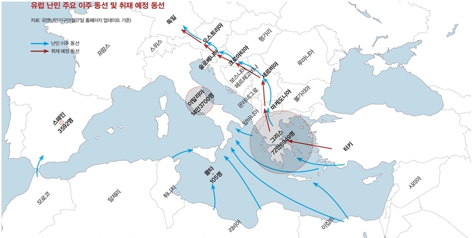 국경을 뚫고 유럽으로 대이동하는 난민은 그들이 향하는 유럽 나라들의 국가 통제력도 시험에 들게 하고 있다. 올해 난민 이동의 특징은 지중해를 건너는 난민이 급증했다는 점이다. 유엔난민기구가 11월27일까지 집계한 바에 따르면, 올해 지중해를 건너 유럽으로 이주한 이들의 규모는 87만4346명이다.