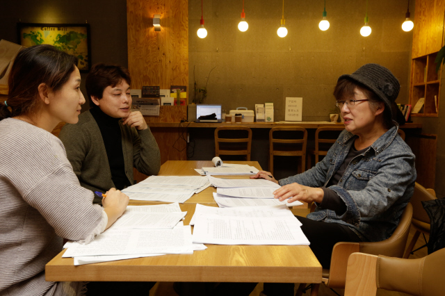 12월7일 서울 마포구 공덕동 한겨레신문사 내 카페에서 손바닥문학상 본심 심사가 열렸다. 왼쪽부터 손바닥문학상 진행을 맡은 박수진 기자, 심사위원 전성태 소설가, 김선주 언론인. 김진수 기자