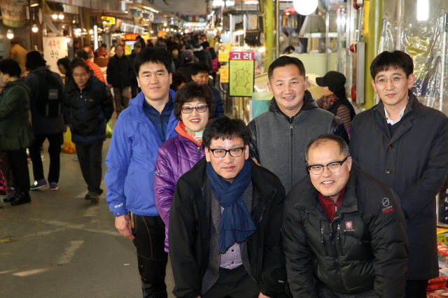지난 12월15일 양창영 변호사(오른쪽 위)와 서정래 망원시장 상인회 회장(왼쪽 아래)이 망원시장 상인들과 함께 즐거운 표정으로 시장통 한가운데서 사진을 찍었다. 류우종 기자