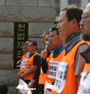 지난 5월28일 헌법재판소는 정부가 전국교직원노동조합(전교조)을 법외노조라고 통보하는 근거가 된 교원노조법 제2조가 합헌이라고 결정한 뒤, 변성호 전교조 위원장과 노조원들이 서울 종로구 헌법재판소 앞에서 결정을 비판하는 기자회견을 열었다. 한겨레 신소영 기자