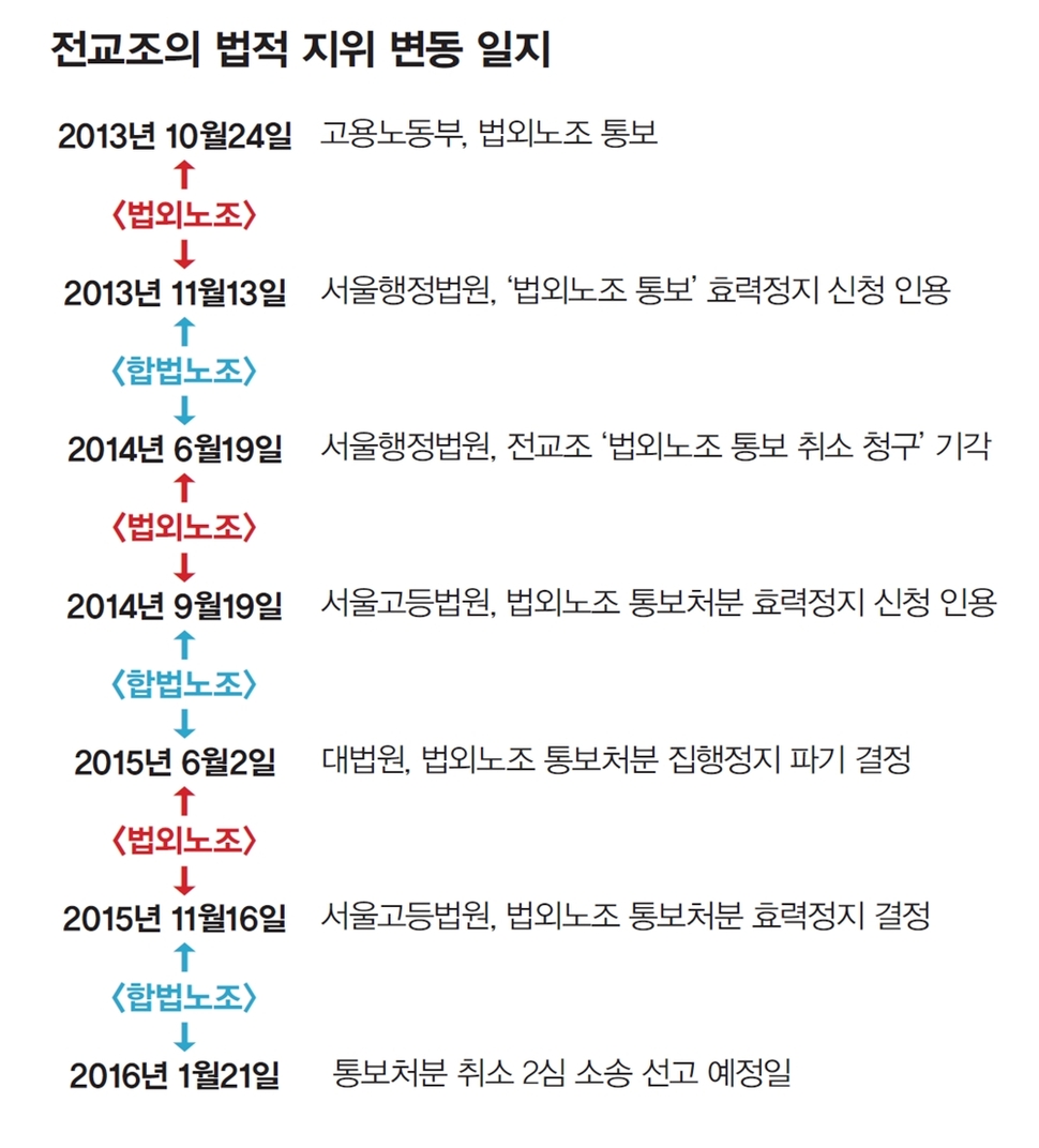 2013년의 ‘통보’ 이후 전교조의 법적 지위는 ‘아노미’ 그 자체였다. 전교조가 고용노동부의 ‘법외노조 통보’에 대응해 제기한 ‘법외노조 통보의 적법성을 따지는 소송’과 ‘법외노조 통보 효력정지 가처분 신청’의 결과에 따라 법적 지위가 왔다갔다 했다. 2년여 사이 여섯 차례 ‘합법노조’와 ‘법외노조’로 옷을 갈아입었다(하단 일지 참조).