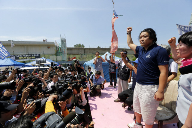 2013년 8월8일 현대자동차 사내하청 해고노동자 최병승씨가 296일간의 철탑농성을 마치고 내려온 뒤 동료들과 기자들에게 소회를 밝히고 있다. 한겨레 김명진 기자