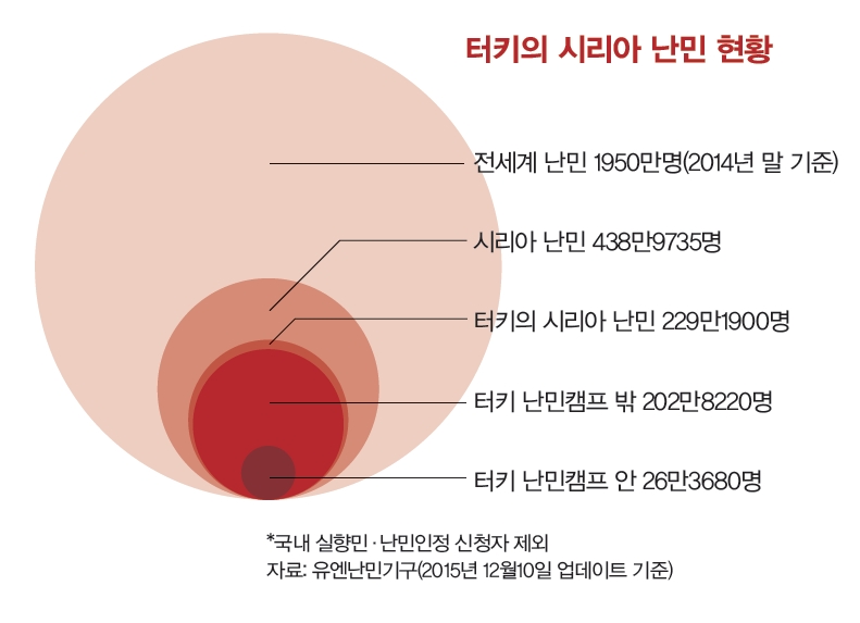터키 남부에 난민캠프 25곳이 있다. 그 안에서 생활하는 난민은 숙식과 한 달에 100터키리라(약 4만원)가량의 지원금을 제공받는다고 캠프에서 생활한 적이 있는 난민들은 말했다. 하지만 터키에선 자밀처럼 캠프 생활을 하지 않는 난민이 대다수다. 터키에 있는 시리아 난민 229만여 명 중 캠프 생활을 하는 난민은 26만여 명에 불과하다(유엔난민기구·2015년 12월10일).