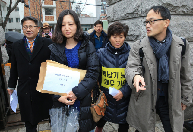 ‘세월호 변호사’로 불리는 박주민 4·13 총선 당선자(서울 은평갑)는 변호사로 활동한 2006년부터 거리에서 싸우는 약자 편에 서왔다. 경찰이 쏜 직사살수에 맞아 중태에 빠진 백남기씨의 딸 백도라지(왼쪽 두 번째)씨와 박 당선자(맨 오른쪽)가 2015년 12월10일 서울 종로구 헌법재판소로 들어서고 있다. 한겨레 탁기형 선임기자