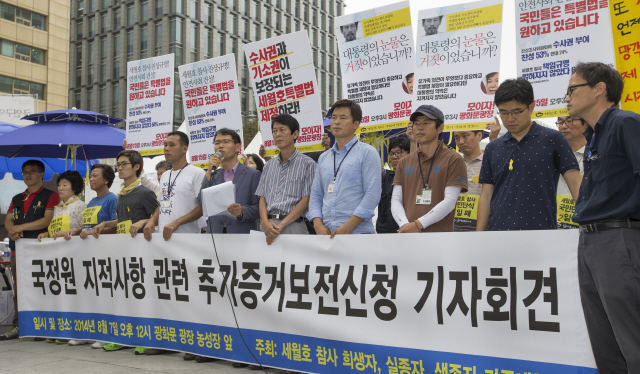 세월호 참사 희생자·실종자·생존자 가족 대책위원회가 2014년 8월7일 서울 광화문 광장에서 ‘세월호 국정원 지적사항 관련 추가증거보전 신청 기자회견’을 하고 있다. 세월호 희생자와 피해자들은 각종 자료를 직접 수집하고 필요한 자료는 법원에 증거보전 신청을 하면서 참사 진상 규명을 위해 온 힘을 쏟고 있다. 한겨레 김성광 기자