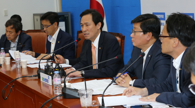 6월22일 서울 여의도 국회에서 열린 더불어민주당 세월호 태스크포스(TF) 첫 회의에서 우상호 원내대표(가운데)가 발언하고 있다. 한겨레 강창광 기자