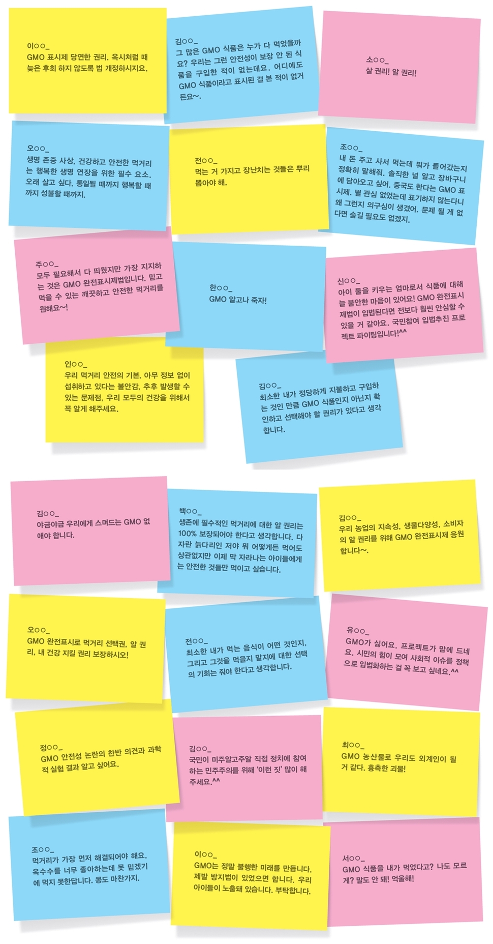 프로젝트가 벽에 부딪힐 때마다 시민들이 붙여준 포스트잇이 길잡이가 돼줄 것이다. “아이 둘을 키우는 엄마로서 GMO 완전표시제법이 입법된다면 전보다 훨씬 안심할 수 있을 거 같아요.” “최소한 내가 그 음식을 먹을지 말지에 대한 선택의 기회는 줘야 해요.” “살 권리! 알 권리!”