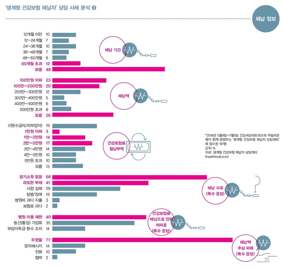 ①보험급여 제한, 가산금 부과, 의료 이용시 부당이득금 징수 등 체납자에 대한 불이익이 강력하고 중복적. ②건강보험료 체납자들에게 보험급여를 못 받게 하는 것은 사회보장에서 ‘보험급여를 받을 권리’의 침해이자 사실상 의료보장의 사각지대. ③보험급여 제한이 세대 단위인 탓에 납부 능력이 없는 이들에게 무차별적으로 적용.
