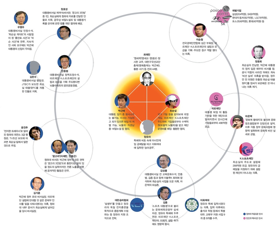 두 개의 태양이 있었다. 보이는 곳에선 박근혜 대통령이 통치하고, 보이지 않는 곳에선 최순실이 조정했다. 그 둘 사이를 부지런히 오가던 매파들은 나랏일을 범법행위로 전락시킨 공범들이다. 박근혜와 최순실을 중심으로 공선과 비선이 섞이고, 역할과 책임은 겹치고 엇갈렸다. 최고권력의 주변을 떠다닌 부나방 같은 이들은 각각의 영역에선 또 하나의 소우주를 이루며 군림했다. 40년 인연의 최태민 가문 일가와 박근혜 대통령은 지금까지 드러난 혐의만으로도 형사처벌이 불가피해 보인다. 관계도의 가장 큰 동심원에 걸린 안종범, 문고리 3인방, 김종, 차은택, 이승철도 수사와 처벌이 반드시 필요한 인물들이다. 박근혜 4년, 비리의 궤도를 따라 돈 치욕스런 이름들을 정리해봤다. _편집자