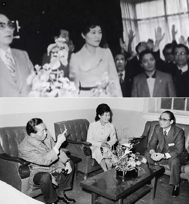 1975년 5월4일 최태민(왼쪽)이 23살이던 영애 박근혜(가운데)와 처음으로 공식석상에 섰다(위쪽 사진). 이날 최태민은 자신이 준비한 ‘구국기도회’에서 박근혜를 명예총재로 추대했다. 1976년 박정희 대통령(왼쪽)이 대한구국선교단 야간진료센터를 방문해 최태민 총재(오른쪽)와 이야기하고 있다. 가운데는 박근혜 당시 대한구국선교단 명예총재. KBS 방송화면 갈무리, 연합뉴스